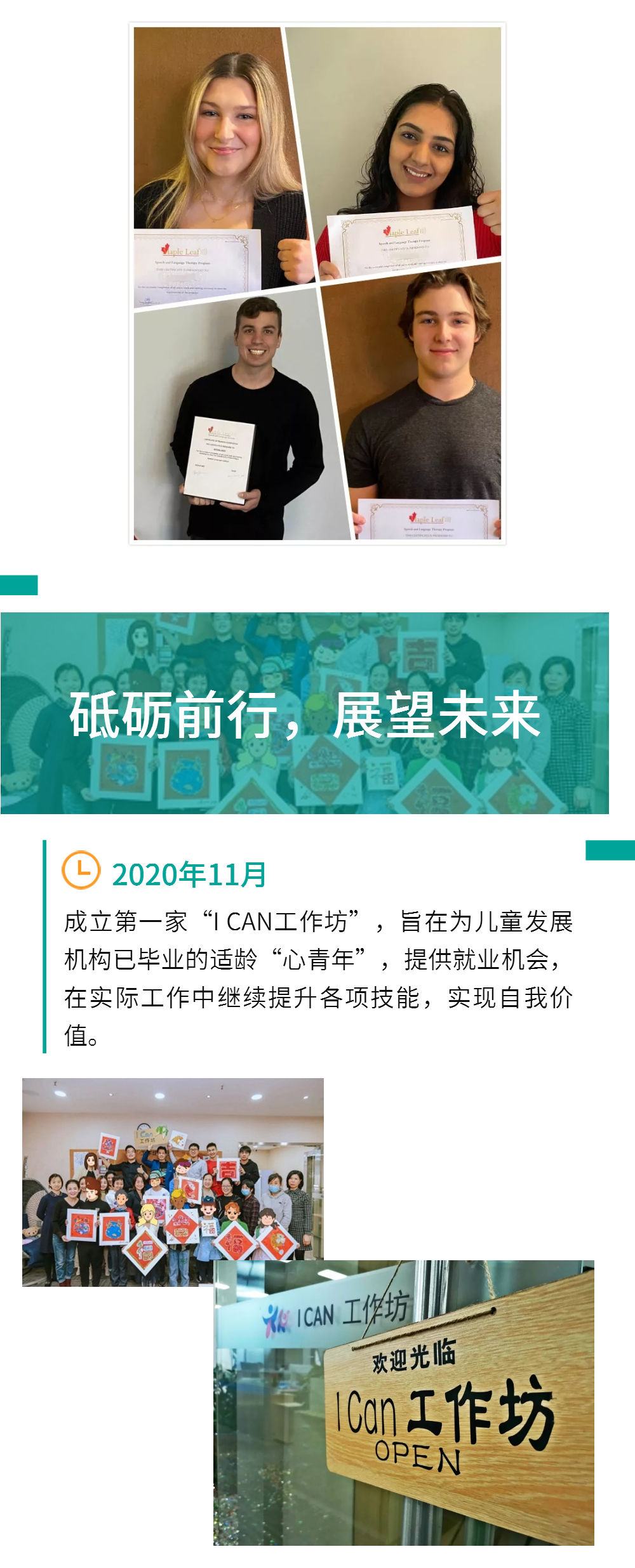 2020年,完成长达3年的体系化课程研发、系统化教具研发,并同时开启“心青年”就业项目,2020年11月成立第一家“I CAN工作坊”,旨在率先为相关机构已毕业的适龄“心青年”,提升就业意识,提供就业机会,在实际工作中继续提升各项机能,实现自我价值。