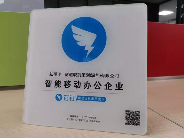 近日,宽道职前策划收到阿里巴巴·钉钉授予的“智能移动办公企业”授牌,编号为DT201916438。